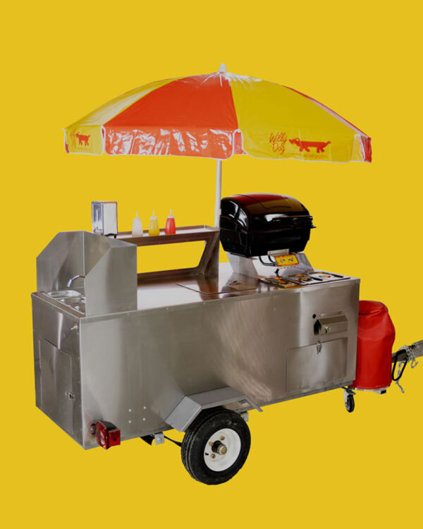 This is a model A-100 cart. I’ll start by showing you our unique Willy Dog umbrella, which is made of weather-resistant eight-panel alternating yellow and red vinyl. Our solid heavy-duty metal pole is hurricane-resistant, so you won’t have to worry about your umbrella flying away anytime soon.