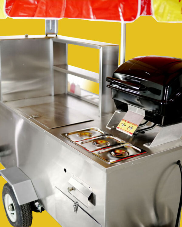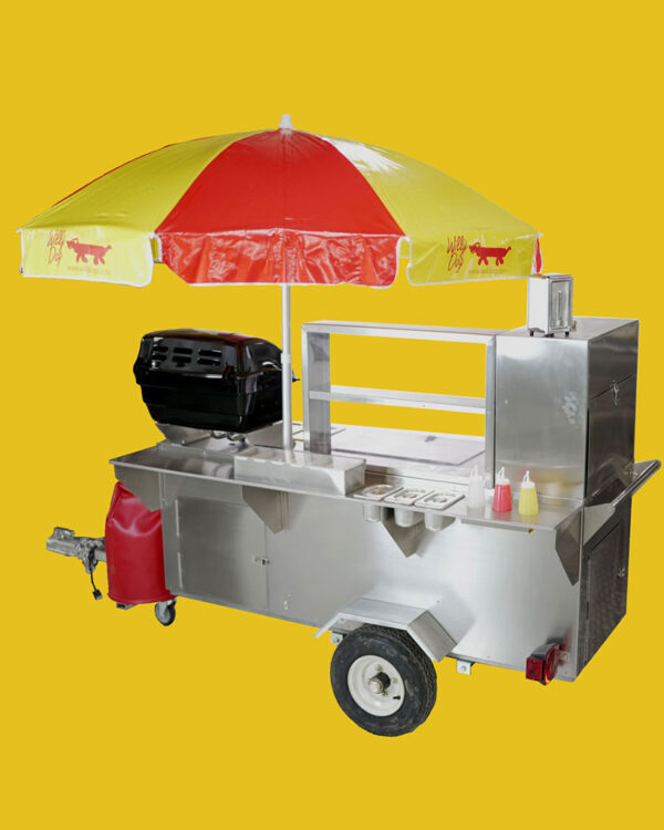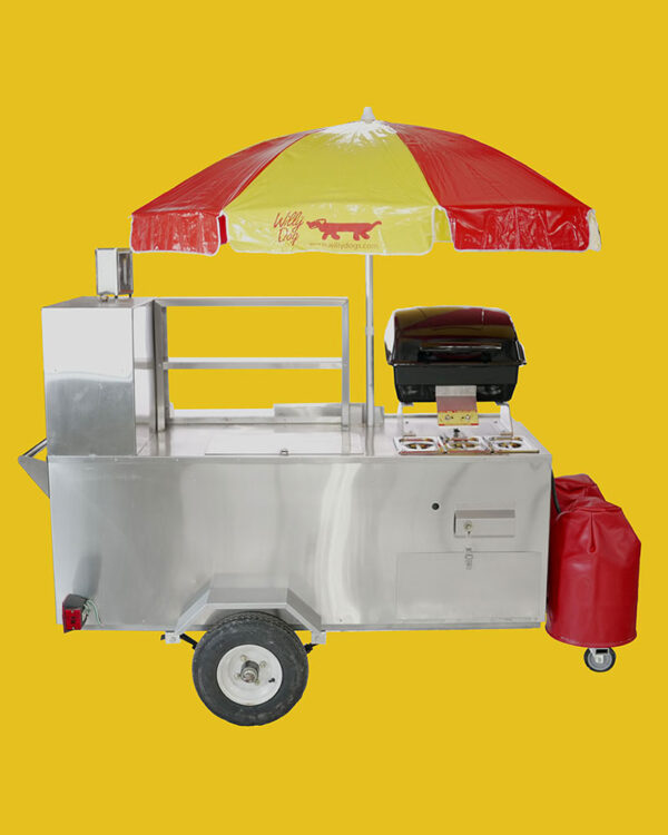 A 101 hot dog cart has a fully insulated, double-storage cooler compartment. This dual cooler is a great place to keep your meat or soda inventory. We have our three stainless steel steamers, where you can keep your hot dogs or sausages steamed or warmed. They’re heated down below using cast iron burners.